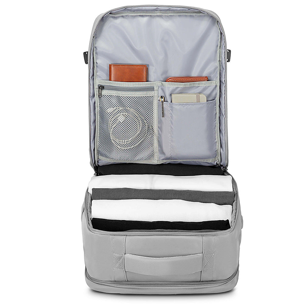 Oui, il est parfaitement adapté comme bagage à main. Ses dimensions (31,5 × 46 × 20 cm) respectent les normes de la plupart des compagnies aériennes pour un usage en cabine. Sa structure permet de transporter vos vêtements, appareils et documents de manière organisée et sécurisée – idéal pour les déplacements professionnels ou les courts séjours. Il dispose également d’une sangle arrière pratique pour l’attacher à une valise à roulettes, facilitant vos déplacements dans les aéroports.