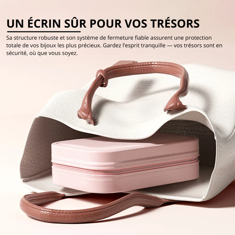 Oui, absolument ! Grâce à son format compact et son design léger, ce coffret à bijoux est idéal pour vous accompagner partout. Il se glisse facilement dans une valise ou un sac à main, et sa structure solide avec fermeture sécurisée garde vos bijoux bien rangés et protégés pendant tous vos déplacements. Fini les accessoires emmêlés ou perdus en voyage!